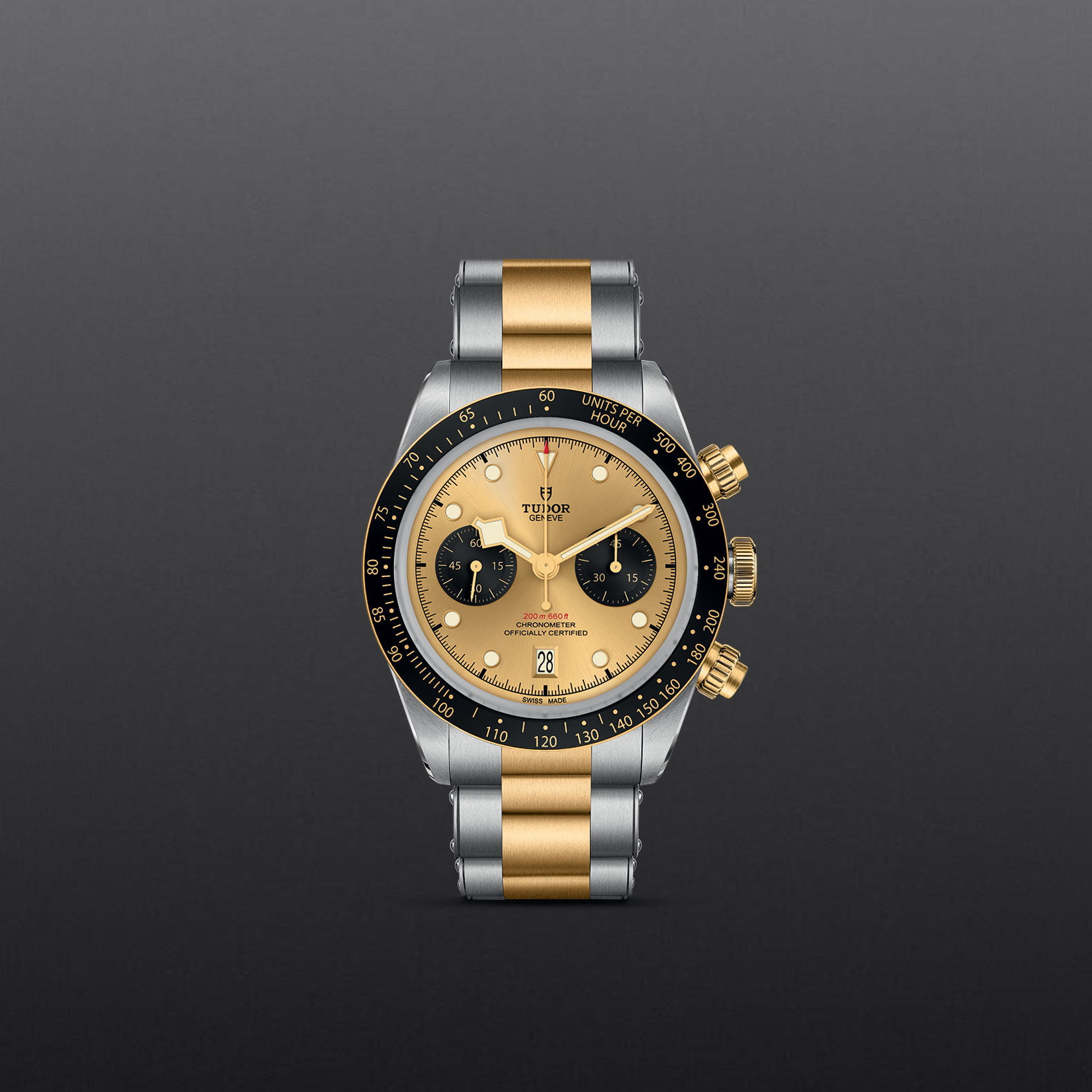 Screw-down winding crown with the TUDOR rose in relief. Solid yellow gold screw-down pushers at 2 and 4 o'clock. Steel covered by a 0.3mm yellow gold cap
