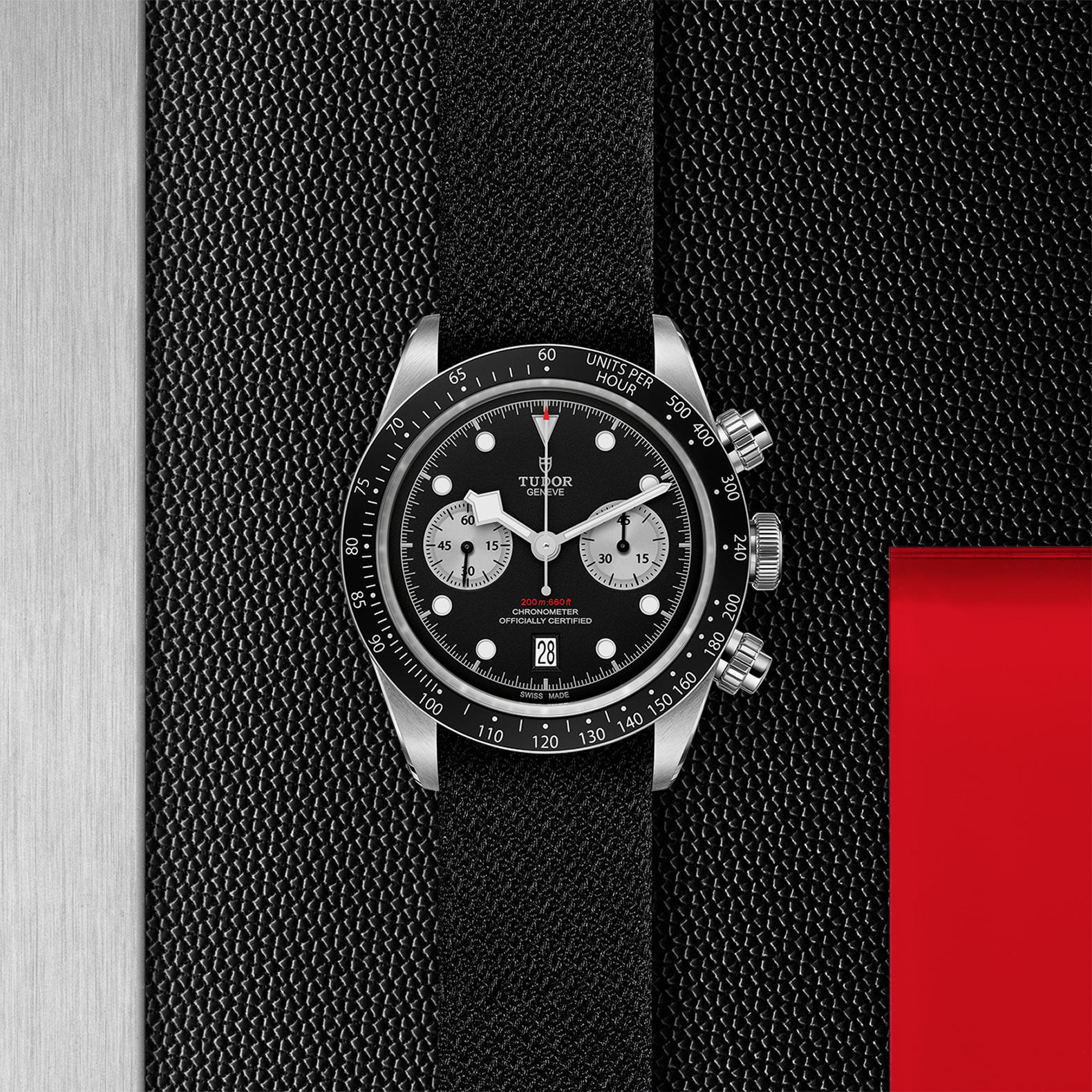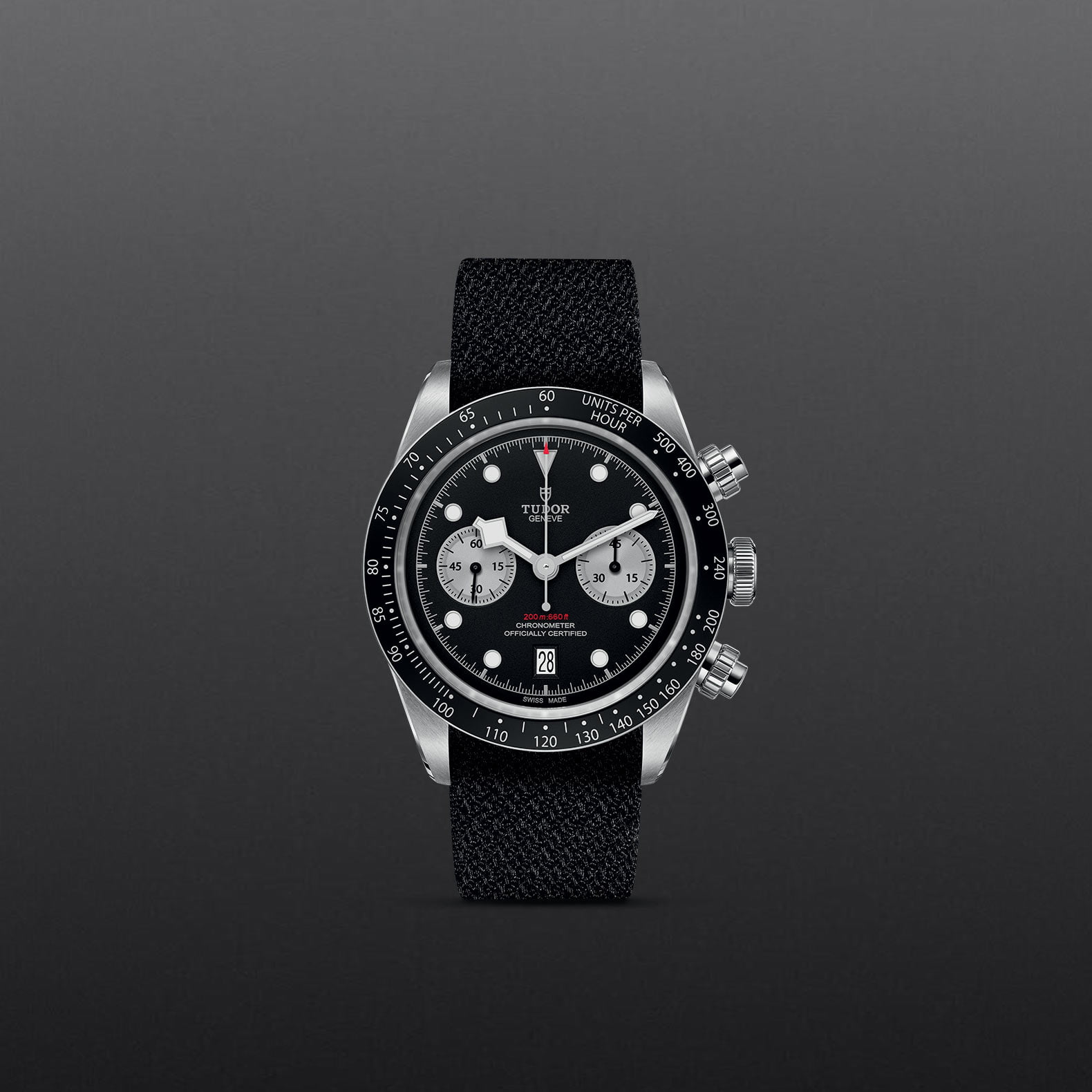 The Black Bay Chrono combines the heritage of divers’ watches represented by the Black Bay family with the queen of the racetrack, the chronograph. The characteristics of the Black Bay collection are preserved in a steel case fitted with pushers inspired by the first generation of Tudor chronographs. A fixed bezel in circular satin-brushed steel with engraved tachymetric scale completes the face of this sporty chronograph.
