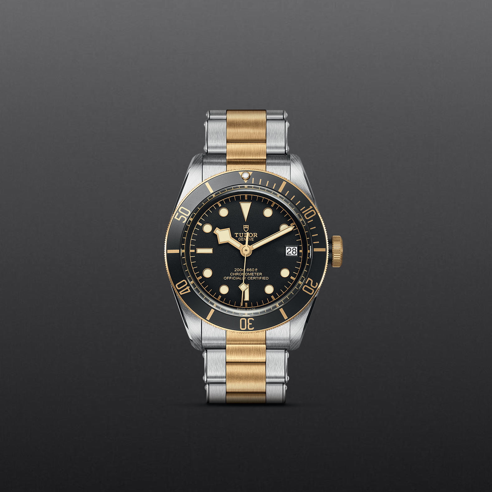 Screw-down winding crown, with the TUDOR rose engraved and lacquered in black, with black anodised aluminium winding crown tube. Steel covered by a 0.3mm yellow gold cap
